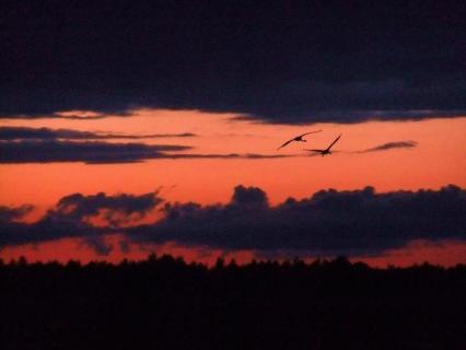 Cranes flying against a blood red sunset